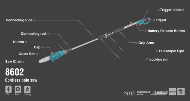 8602 naudoja 20 V 2,0 Ah ličio jonų akumuliatorių. Šis strypinis pjūklas turi apsaugą nuo viršsrovės, kuri apsaugo akumuliatorių nuo perkrovimo ir pažeidimų, taip padidindama šio gaminio ilgaamžiškumą.