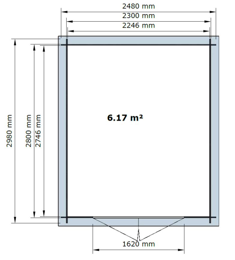 - Išoriniai matmenys: 250 x 300 cm (plotis x gylis)