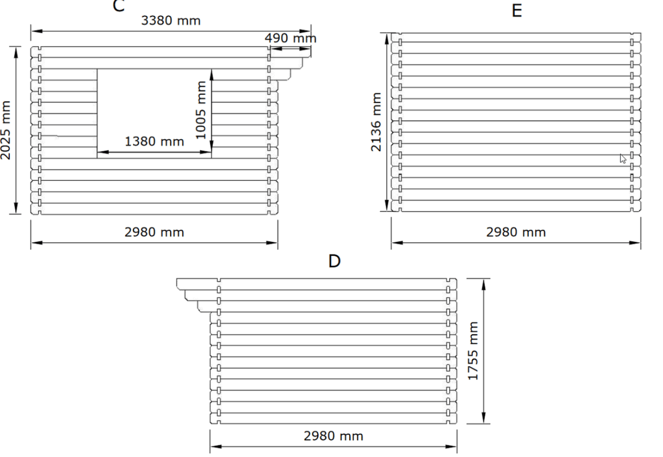 Į komplektaciją neįeina stogo danga, grindys, medienos dažai ir tvirtinimo elementai (medsraigčiai).
