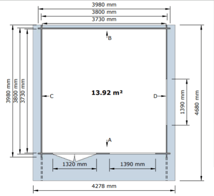 · Išoriniai matmenys: 400 x 400 cm (plotis x gylis)